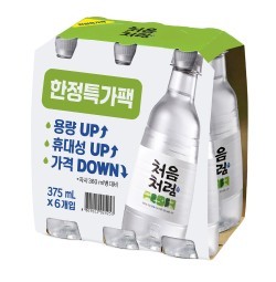 이처럼 꾸준한 페트 소주의 성장 트렌드에 맞춰 새롭게 선보이는 '처음처럼 375㎖ 페트'는 360㎖ 병 제품 보다 용량은 15㎖ 증가했음에도 병 제품보다 저렴한 가격의 가성비와 페트 제품 특유의 휴대 편의성이 좋은 특징을 갖고 있으며, 우선, 대형마트와 슈퍼마켓에서 6입 패키지 혹은 박스 단위로 한정 판매할 예정이다.