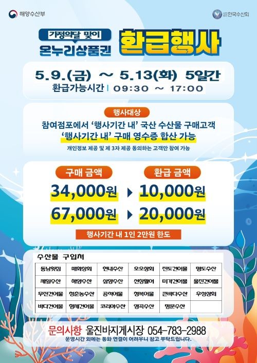 이번 행사는 경북도 내 162개 인정(등록)시장 중 10개시장(울진바지게시장 포함)이 선정되어 진행하는 것으로 울진바지게시장 내 23개 대상 점포에서 5월 13일까지 국내산 수산물 구매고객에게 최대 2만원의 온누리상품권을 지급하고 있다.