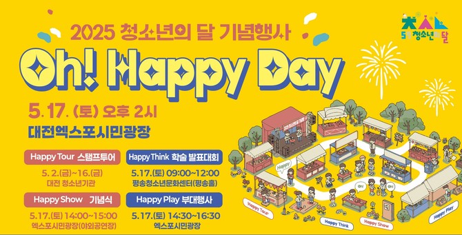 [프라임경제] 대전시는 오는 5월17일 2025년도 청소년의 달을 맞아 엑스포시민광장과 평송청소년문화센터에서 기념행사 'Oh! Happy Day'를 개최한다고 밝혔다.