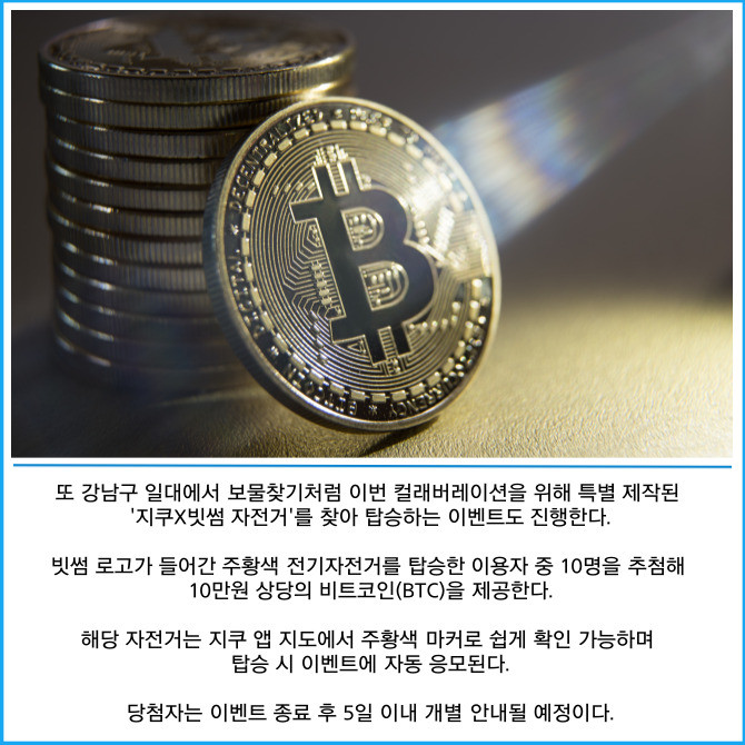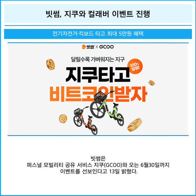 [프라임경제] 빗썸은 퍼스널 모빌리티 공유 서비스 지쿠(GCOO)와 오는 6월30일까지 이벤트를 선보인다고 13일 밝혔다.