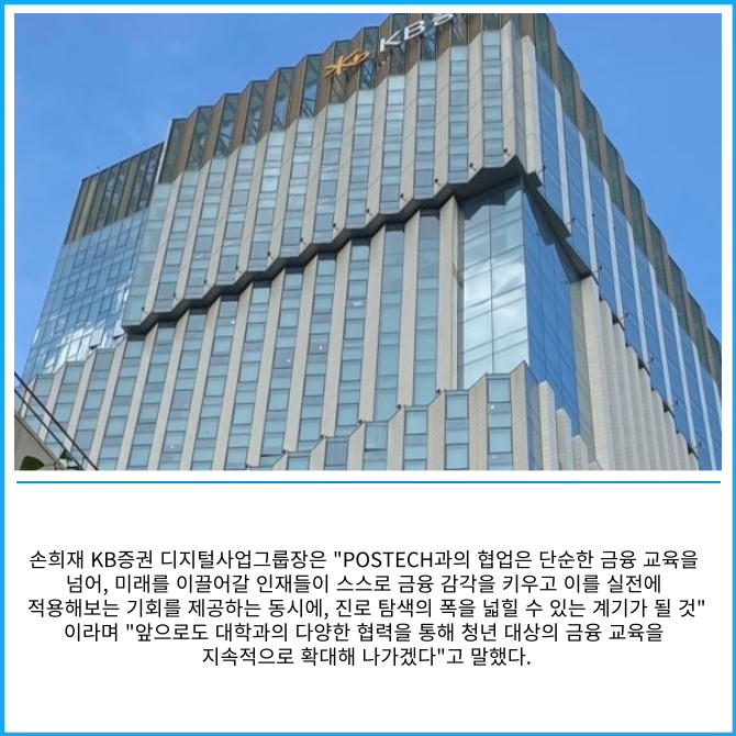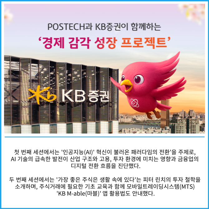 [프라임경제] KB증권은 미래 인재 양성을 위해 포항공과대학교(POSTECH) 신입생을 대상으로 금융 교육 프로그램 '경제 감각 성장 프로젝트' 강연을 진행했다고 13일 밝혔다.