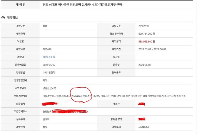 13일 본지 취재 결과, 영암군은 '상대포 역사공원 경관조명 설치공사 LED 경관조명기구 구매' 입찰에서 단독 응찰한 충남 소재 H사와 588,933,600원에 수의계약을 체결한 것으로 확인됐다.
