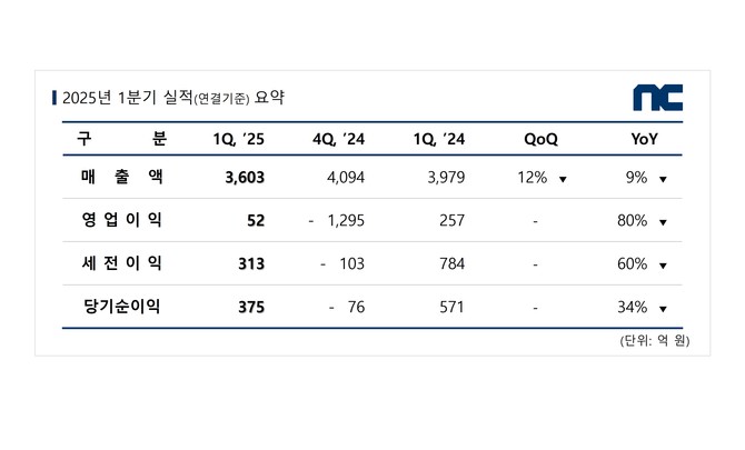 [프라임경제] 엔씨소프트(036570)가 2025년 1분기 실적 결산(연결기준) 결과 매출 3603억원, 영업이익 52억원, 당기순이익 375억원을 기록했다고 14일 밝혔다.