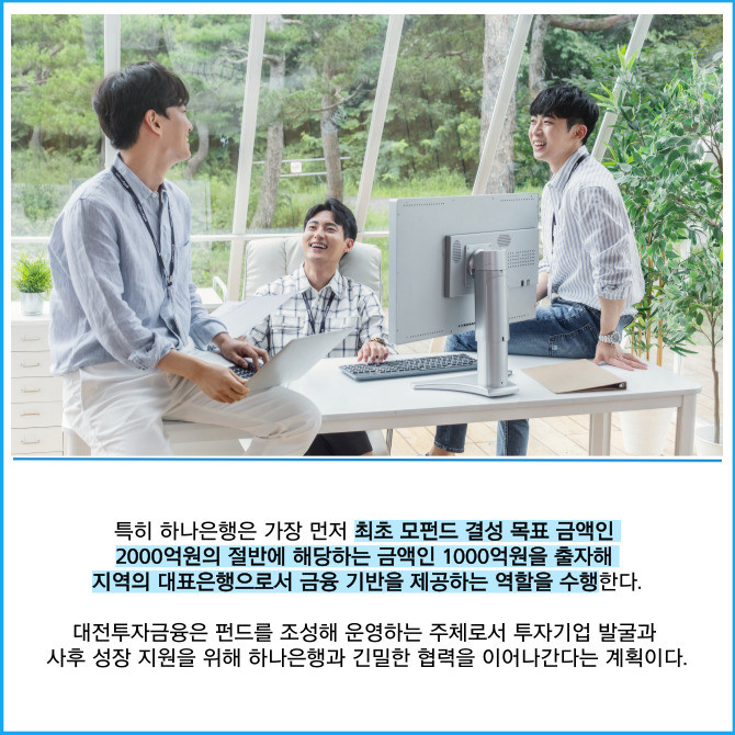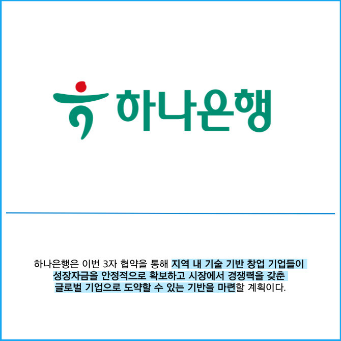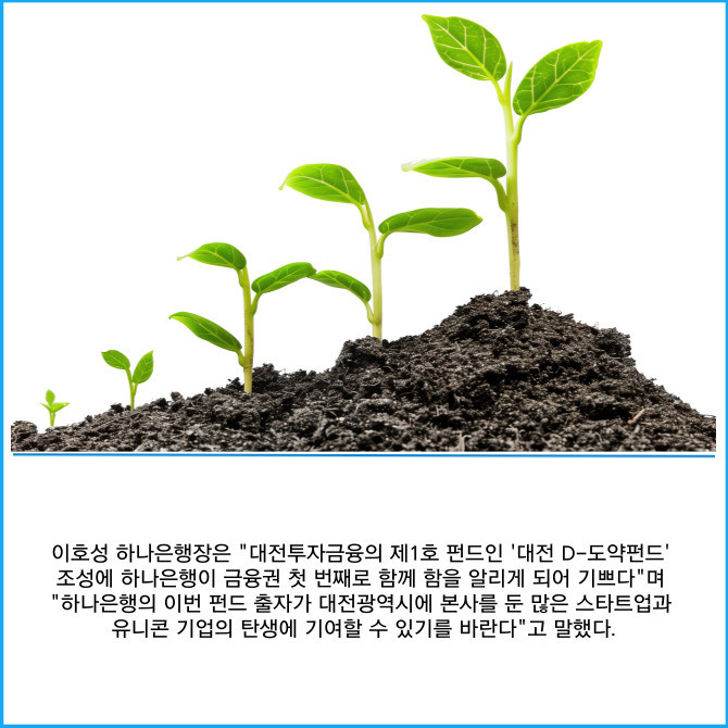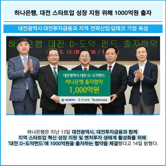 [프라임경제] 하나은행은 지난 13일 대전광역시, 대전투자금융과 함께 지역 스타트업 혁신 성장 지원 및 벤처투자 생태계 활성화를 위해 '대전 D-도약펀드'에 1000억원을 출자하는 협약을 체결했다고 14일 밝혔다.