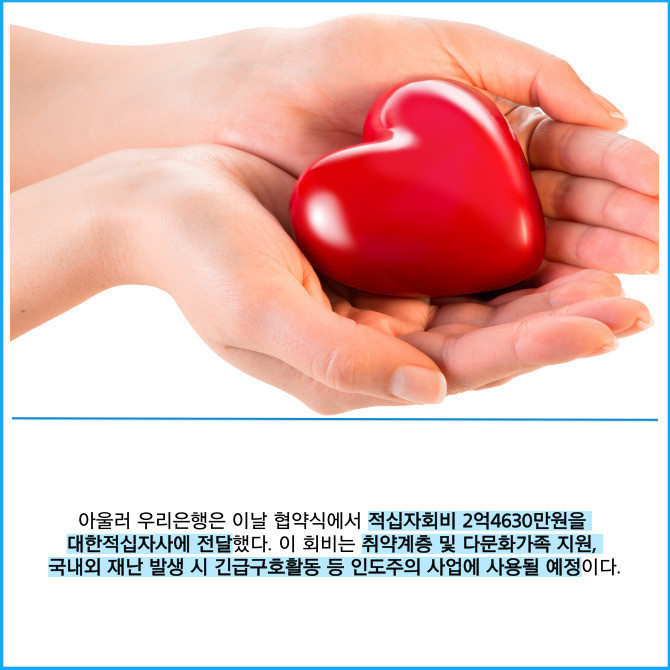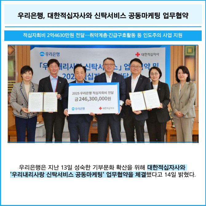 [프라임경제] 우리은행은 지난 13일 성숙한 기부문화 확산을 위해 대한적십자사와 '우리내리사랑 신탁서비스 공동마케팅' 업무협약을 체결했다고 14일 밝혔다.
