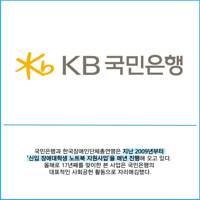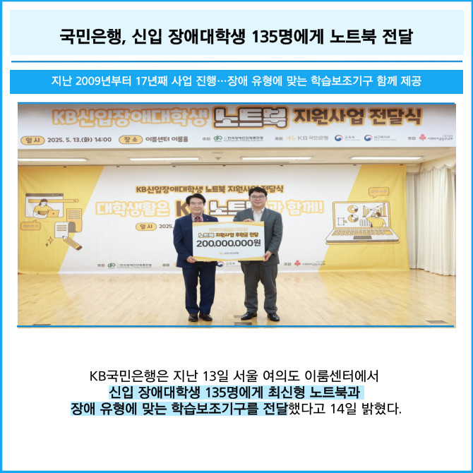 [프라임경제] KB국민은행은 지난 13일 서울 여의도 이룸센터에서 신입 장애대학생 135명에게 최신형 노트북과 장애 유형에 맞는 학습보조기구를 전달했다고 14일 밝혔다.