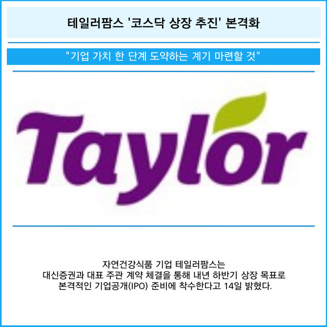 [프라임경제] 자연건강식품 기업 테일러팜스는 대신증권과 대표 주관 계약 체결을 통해 내년 하반기 상장 목표로 본격적인 기업공개(IPO) 준비에 착수한다고 14일 밝혔다.