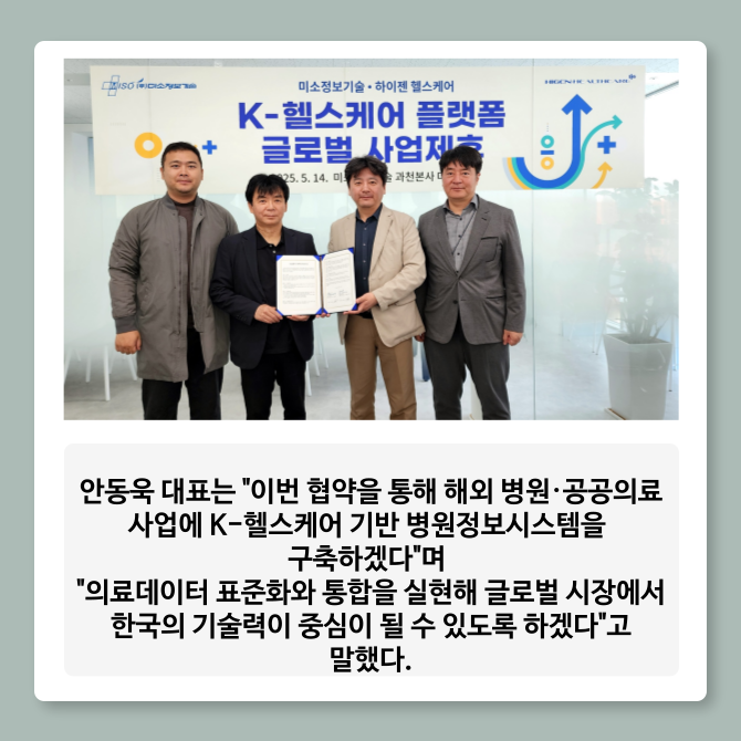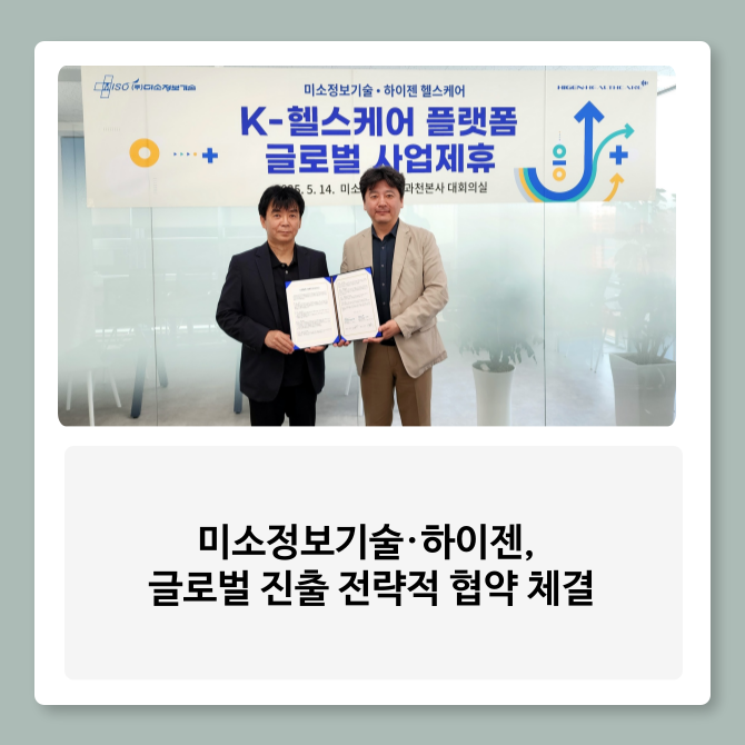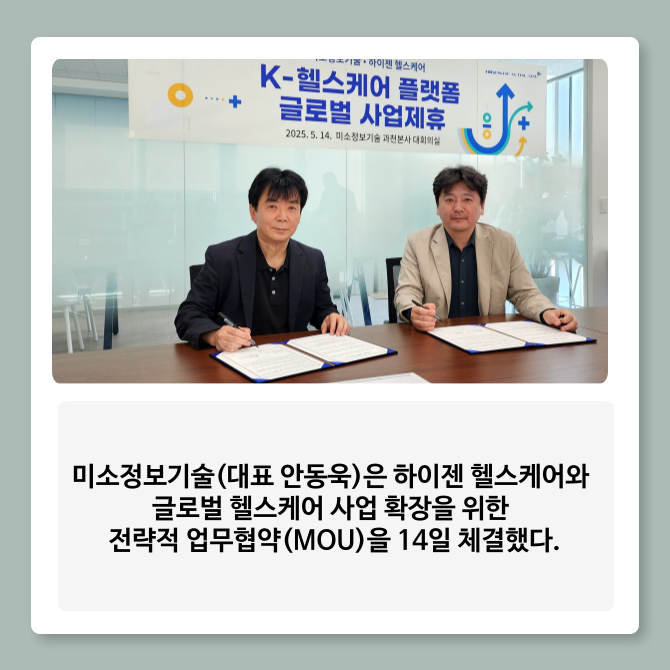 [프라임경제] 디지털 헬스케어 전문기업 미소정보기술(대표 안동욱)은 병원정보시스템(HIS, EMR) 전문기업 하이젠 헬스케어(대표 이용덕)와 글로벌 헬스케어 사업 확장을 위한 전략적 업무협약(MOU)을 14일 체결했다.