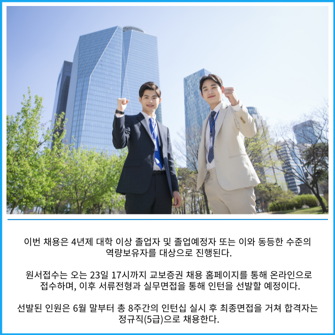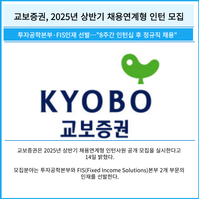 [프라임경제] 교보증권은 2025년 상반기 채용연계형 인턴사원 공개 모집을 실시한다고 14일 밝혔다.