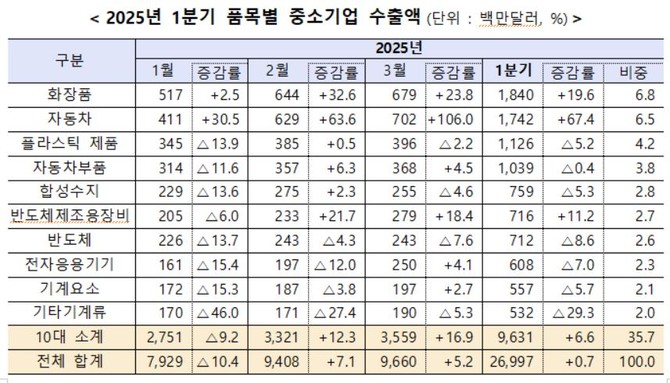 이순배 글로벌성장정책관은 "중소기업 수출은 화장품 등 주력 품목의 강세로 5분기 연속 증가세를 보이고 있다"며 "미국의 관세 조치가 본격화되고 있는 만큼 이를 면밀히 모니터링하고, 대응을 위한 추가 지원책을 조속히 추진하겠다"고 말했다.