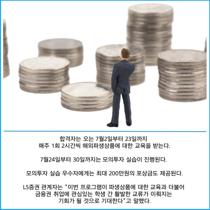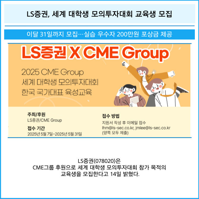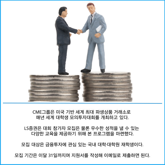 [프라임경제] LS증권(078020)은 CME그룹 후원으로 세계 대학생 모의투자대회 참가 목적의 교육생을 모집한다고 14일 밝혔다.