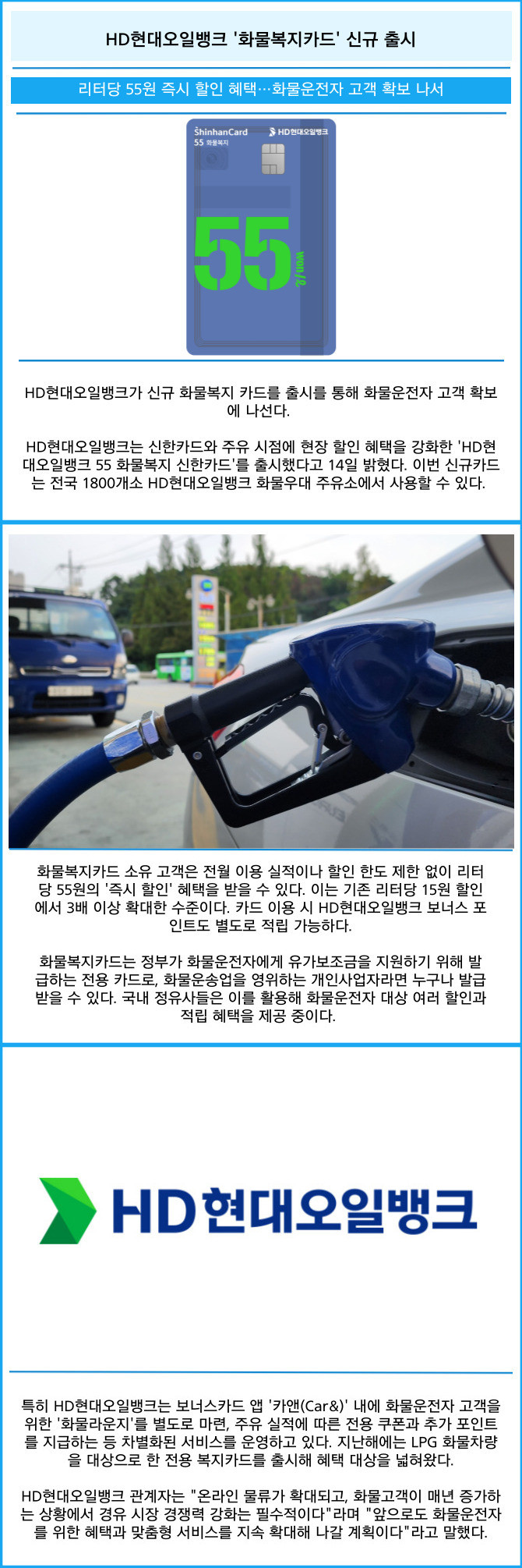 HD현대오일뱅크는 신한카드와 주유 시점에 현장 할인 혜택을 강화한 'HD현대오일뱅크 55 화물복지 신한카드'를 출시했다고 14일 밝혔다. 이번 신규카드는 전국 1800개소 HD현대오일뱅크 화물우대 주유소에서 사용할 수 있다.