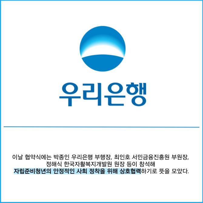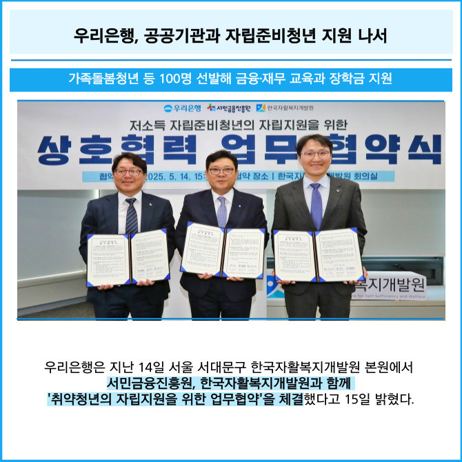 [프라임경제] 우리은행은 지난 14일 서울 서대문구 한국자활복지개발원 본원에서 서민금융진흥원, 한국자활복지개발원과 함께 '취약청년의 자립지원을 위한 업무협약'을 체결했다고 15일 밝혔다.