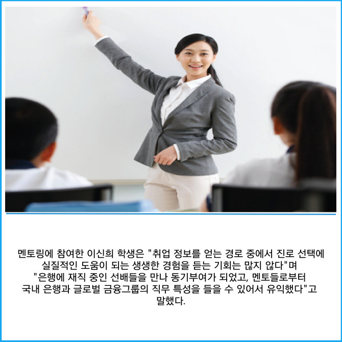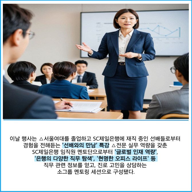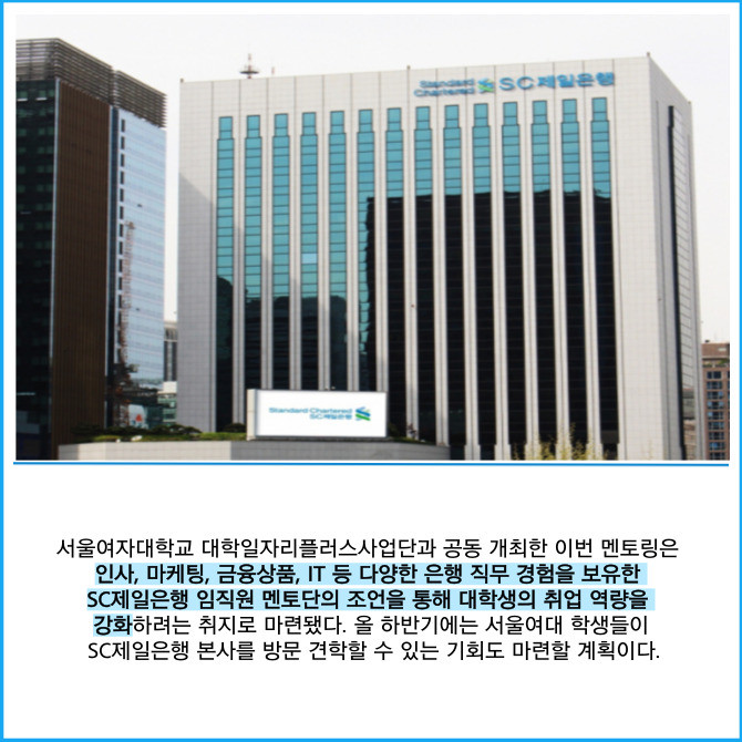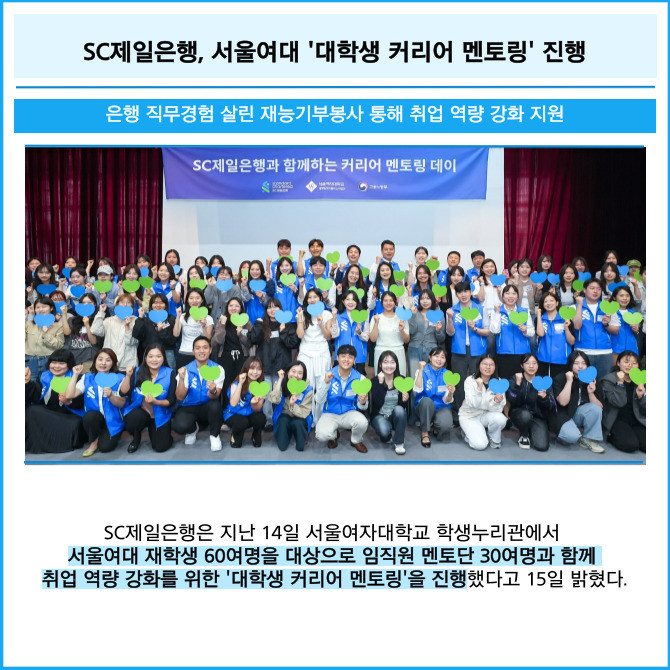 [프라임경제] SC제일은행은 지난 14일 서울여자대학교 학생누리관에서 서울여대 재학생 60여명을 대상으로 임직원 멘토단 30여명과 함께 취업 역량 강화를 위한 '대학생 커리어 멘토링'을 진행했다고 15일 밝혔다.