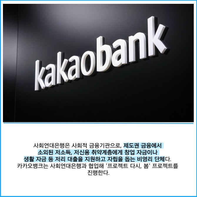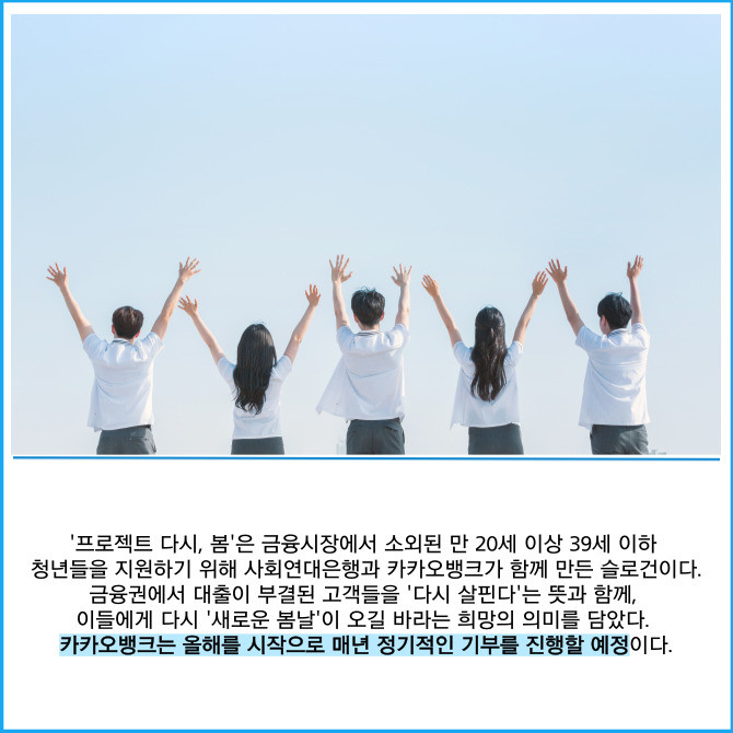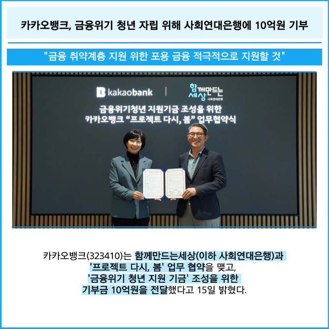 [프라임경제] 카카오뱅크(323410)는 함께만드는세상(이하 사회연대은행)과 '프로젝트 다시, 봄' 업무 협약을 맺고, '금융위기 청년 지원 기금' 조성을 위한 기부금 10억원을 전달했다고 15일 밝혔다.