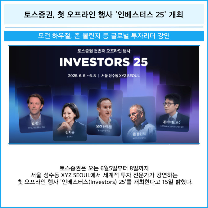 [프라임경제] 토스증권은 오는 6월5일부터 8일까지 서울 성수동 XYZ SEOUL에서 세계적 투자 전문가가 강연하는 첫 오프라인 행사 '인베스터스(Investors) 25'를 개최한다고 15일 밝혔다.