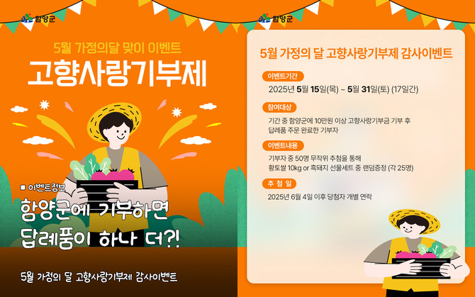 [프라임경제] 함양군이 5월 가정의 달을 맞아 고향사랑기부제에 참여한 기부자에게 감사의 마음을 전하고자 5월15일부터 31일까지 '고향사랑기부제 감사 이벤트'를 진행한다.