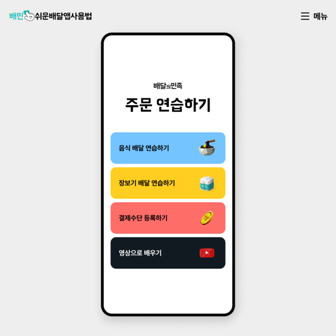배민 운영사 우아한형제들은 디지털 기기가 낯선 정보약자 및 배달앱을 사용해보지 않은 사람들이 주문과 배달 전 과정을 쉽게 이해할 수 있도록 돕는 '쉬운 배달앱 사용법'을 개편했다고 15일 밝혔다.