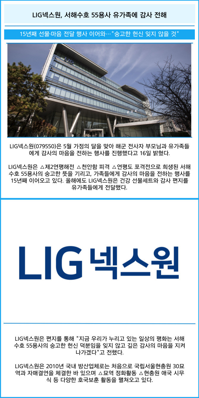 [프라임경제] LIG넥스원(079550)은 5월 가정의 달을 맞아 해군 전사자 부모님과 유가족들에게 감사의 마음을 전하는 행사를 진행했다고 16일 밝혔다.