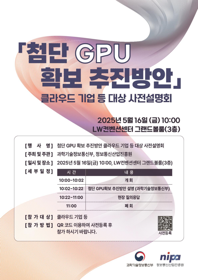 과기정통부는 이번 설명회에서 도출된 의견 등을 종합 고려해 다음주 중 첨단 GPU 자원을 구축, 운영할 CSP 공모를 시작할 예정이다. 이어 오는 7월까지 CSP 선정과 협약 체결 등을 마무리할 방침이다.