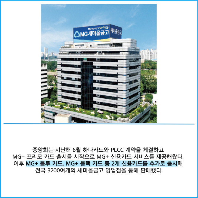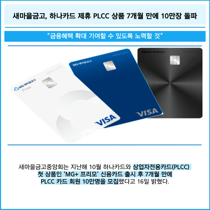 [프라임경제] 새마을금고중앙회는 지난해 10월 하나카드와 상업자전용카드(PLCC) 첫 상품인 'MG+ 프리모' 신용카드 출시 후 7개월 만에 PLCC 카드 회원 10만명을 모집했다고 16일 밝혔다.
