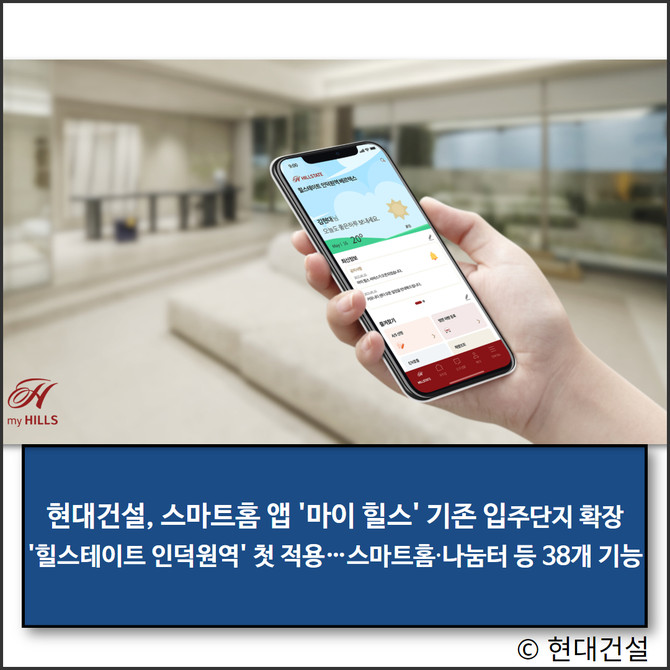 현대건설 관계자는 "고객 맞춤형 서비스 플랫폼 '마이 힐스'를 기존 입주단지에 적용함으로써 더 많은 고객들에게 진화하는 스마트홈 기술과 다양화되는 주거 서비스 경험을 제공하고자 했다"며 "변화하는 디지털 트렌드와 라이프 스타일에 맞춰 차별화된 주거상품과 서비스를 지속적으로 선보일 것"이라고 말했다.