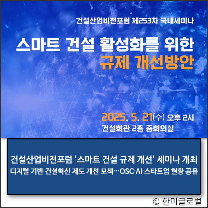 이번 세미나는 디지털 트윈, 인공지능(AI), 드론, 로봇, OSC(탈현장건설) 등 스마트 건설 기술의 확산을 위한 제도 개선과 현장 적용 확대 방안을 모색하기 위해 마련됐다.