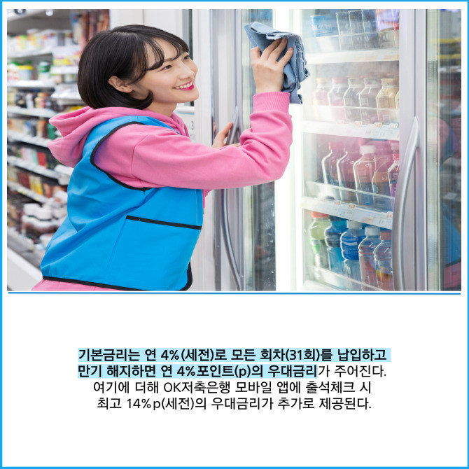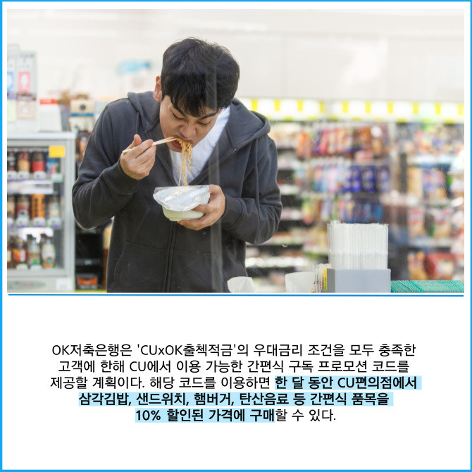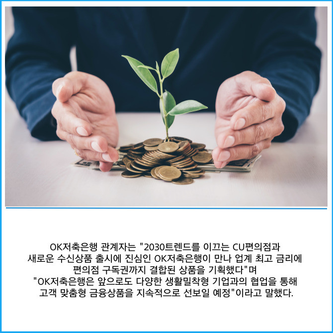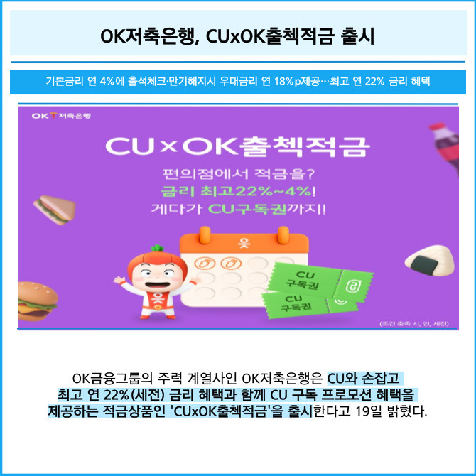 [프라임경제] OK금융그룹의 주력 계열사인 OK저축은행은 CU와 손잡고 최고 연 22%(세전) 금리 혜택과 함께 CU 구독 프로모션 혜택을 제공하는 적금상품인 'CUxOK출첵적금'을 출시한다고 19일 밝혔다.
