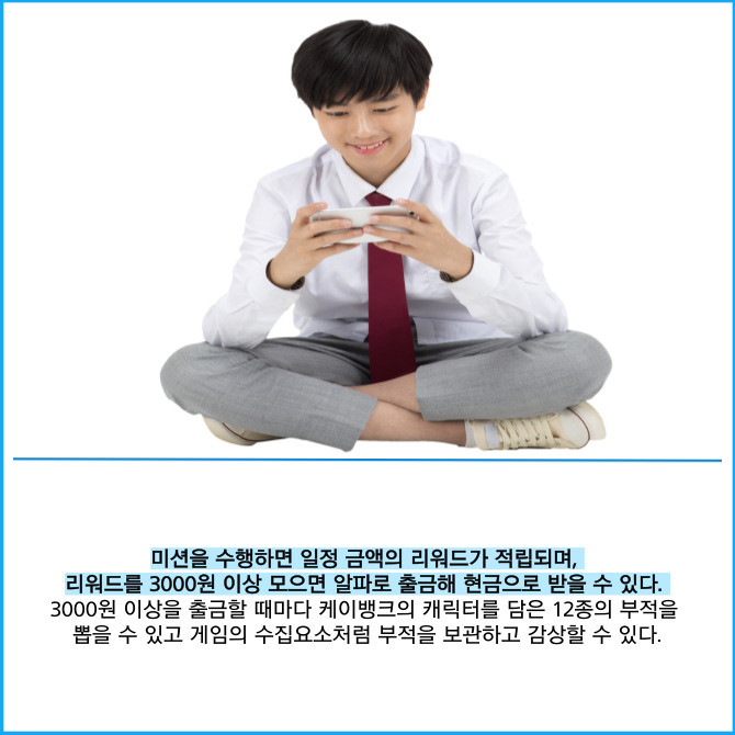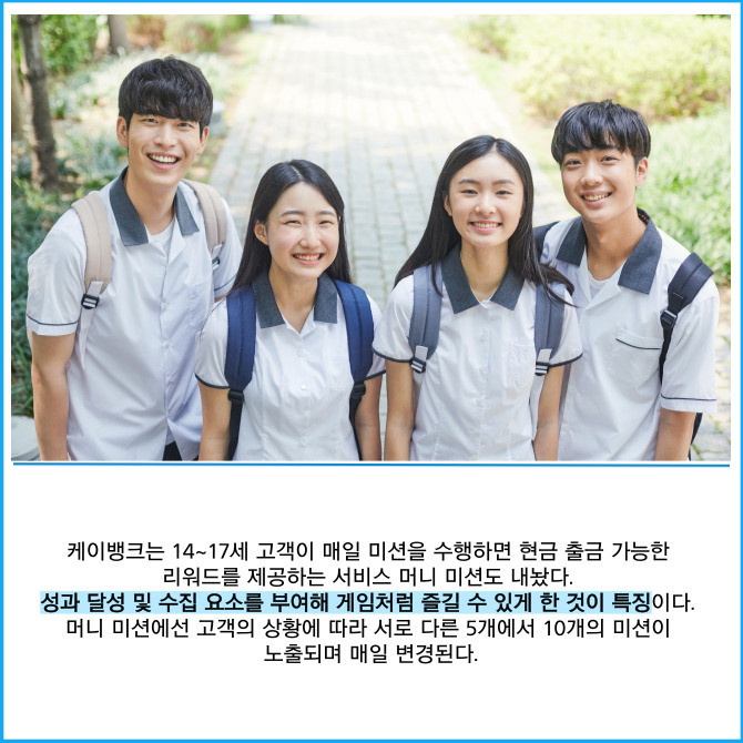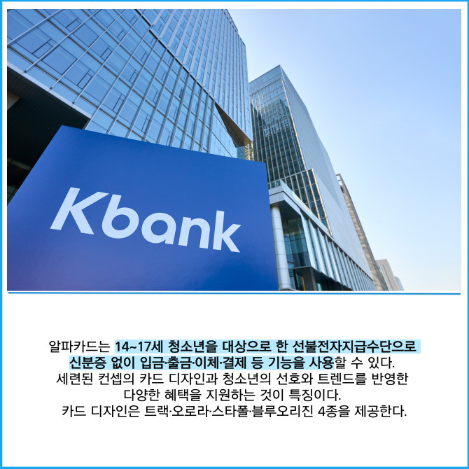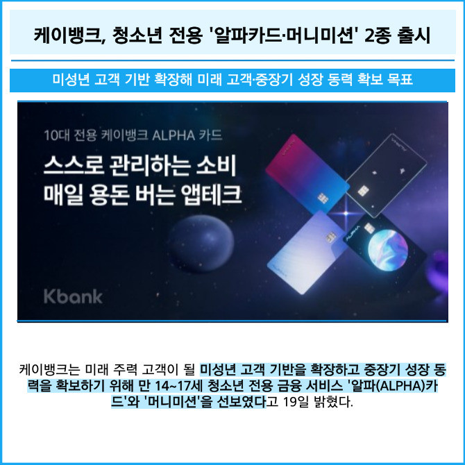 [프라임경제] 케이뱅크는 미래 주력 고객이 될 미성년 고객 기반을 확장하고 중장기 성장 동력을 확보하기 위해 만 14~17세 청소년 전용 금융 서비스 '알파(ALPHA)카드'와 '머니미션'을 선보였다고 19일 밝혔다.