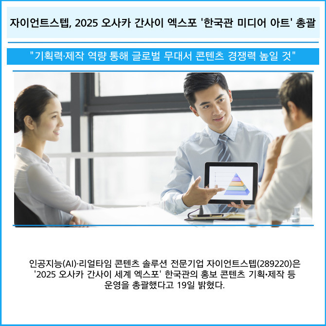[프라임경제] 인공지능(AI)·리얼타임 콘텐츠 솔루션 전문기업 자이언트스텝(289220)은 '2025 오사카 간사이 세계 엑스포' 한국관의 홍보 콘텐츠 기획∙제작 등 운영을 총괄했다고 19일 밝혔다.