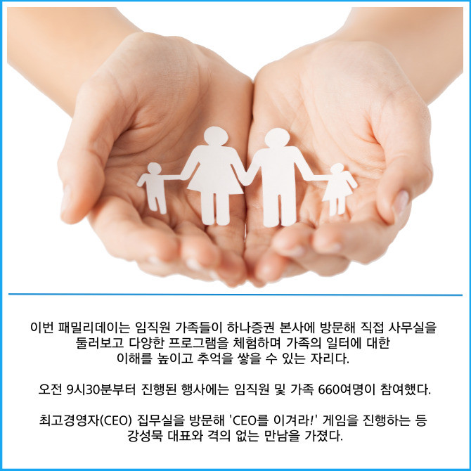 [프라임경제] 하나증권은 가정의 달을 맞아 임직원 가족들을 초청해 패밀리데이 행사를 진행했다고 19일 밝혔다.
