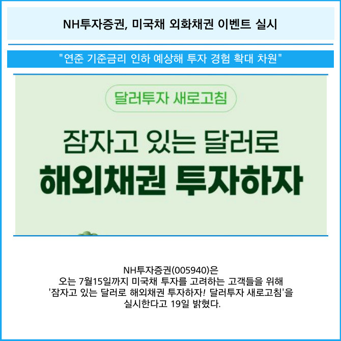 [프라임경제] NH투자증권(005940)은 오는 7월15일까지 미국채 투자를 고려하는 고객들을 위해 '잠자고 있는 달러로 해외채권 투자하자! 달러투자 새로고침'을 실시한다고 19일 밝혔다.