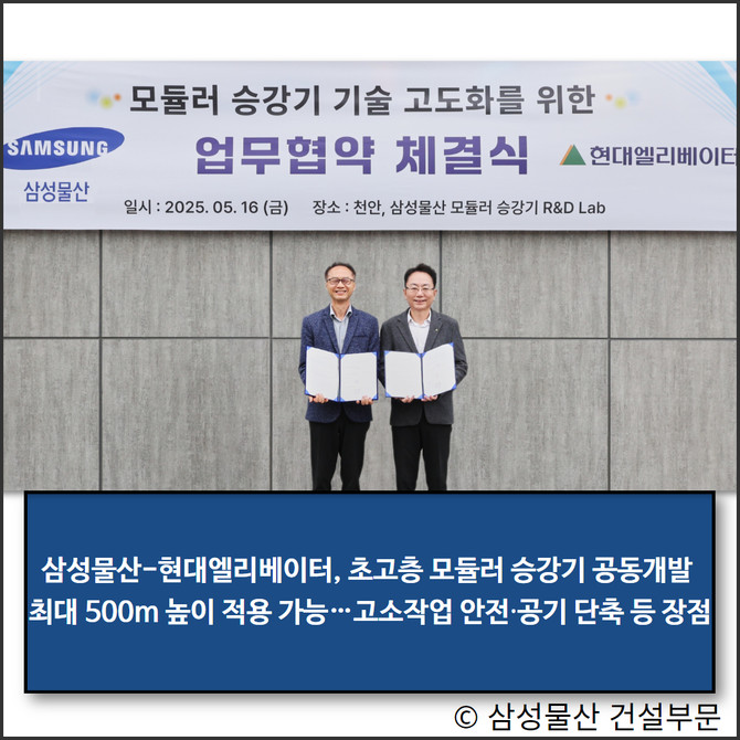지난 16일 삼성물산은 충남 천안시 서북구에 위치한 삼성물산 모듈러 승강기 R&D Lab에서 현대엘리베이터와 모듈러 승강기 기술 고도화를 위한 업무협약(MOU)을 체결했다. 이를 계기로 양사는 지난해 공동개발한 모듈러 승강기 기술을 고도화하고 그 범위를 초고층용으로 확대한다는 방침이다.