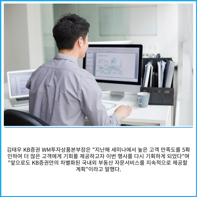 오는 26일부터 다음달 10일까지 진행되는 이번 세미나는 KB증권 TAX솔루션부 부동산연구소가 지난해에 이어 2년 연속 실시하는 행사로, 미국 부동산 투자에 관심있는 고객에게 1:1 개별 상담을 통해 유용한 현지 정보를 제공한다.
