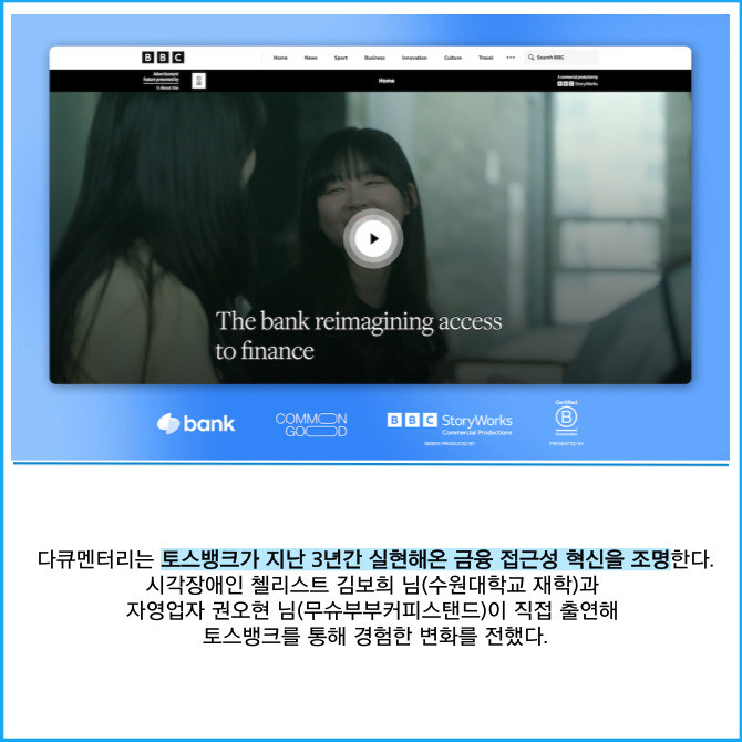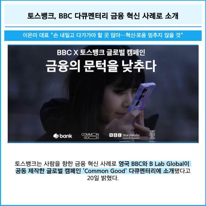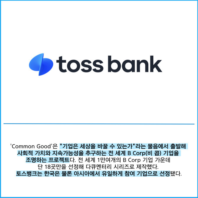[프라임경제] 토스뱅크는 사람을 향한 금융 혁신 사례로 영국 BBC와 B Lab Global이 공동 제작한 글로벌 캠페인 'Common Good' 다큐멘터리에 소개됐다고 20일 밝혔다.