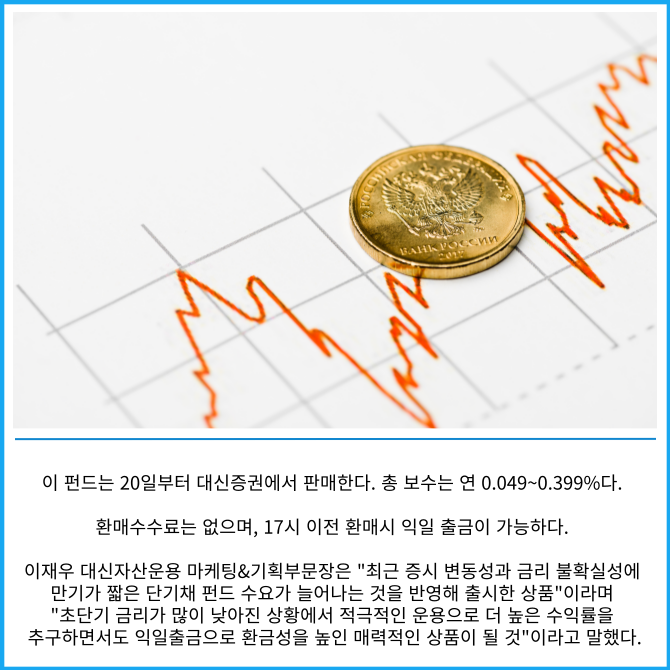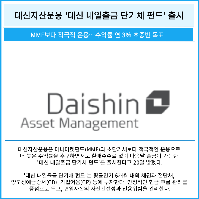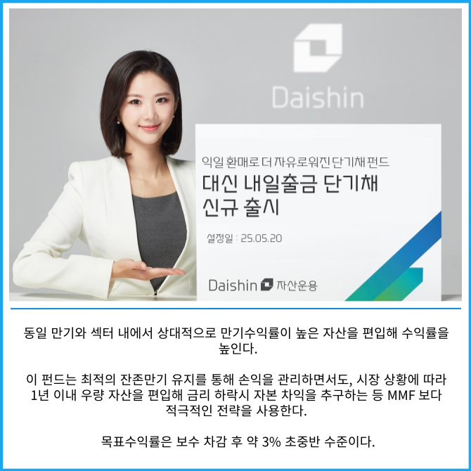 [프라임경제] 대신자산운용은 머니마켓펀드(MMF)와 초단기채보다 적극적인 운용으로 더 높은 수익률을 추구하면서도 환매수수료 없이 다음날 출금이 가능한 '대신 내일출금 단기채 펀드'를 출시한다고 20일 밝혔다.