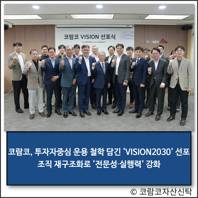 아울러 '원 코람코(One KORAMCO)'정신에 입각해 협업 체계를 강화하는 한편, 시스템 기반 경영으로 업무 효율성과 실행력을 높이기 위한 조직 재구조화였다. 'VISION2030'은 이러한 변화를 바탕으로 한 회사의 성장목표와 경영 지향점을 명문화한 결과물이다.