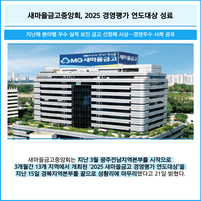 [프라임경제] 새마을금고중앙회는 지난 3월 광주전남지역본부를 시작으로 3개월간 13개 지역에서 개최된 '2025 새마을금고 경영평가 연도대상'을 지난 15일 경북지역본부를 끝으로 성황리에 마무리했다고 21일 밝혔다.