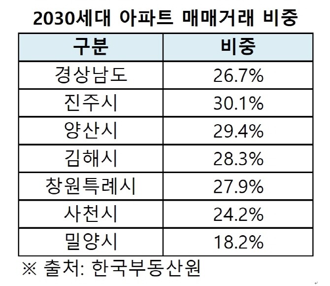1분기 경남 아파트 매매거래 연령대별 거래분포(한국부동산원 기준) 가운데 26.7%가 2030세대를 통해 이뤄졌다. 시 지역 가운데는 진주시가 30.1%로 비중이 가장 컸으며, 양산시가 29.4%로 뒤를 이었다. 타지역과 비교해 '낮은 노후도 비율' 역시 양산시가 젊은 도시로 자리 잡는데 영향을 주고 있다.