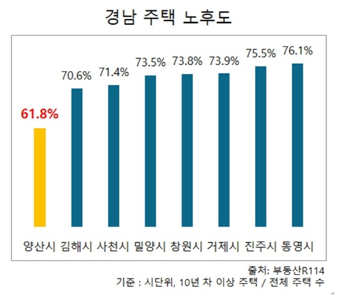 부동산R114 자료에 따르면, 올해 입주예정 물량까지 포함해 양산시 아파트는 13만3275가구다. 이중 준공 10년을 초과한 노후 단지는 8만2369가구로, 전체 아파트 61.8%를 차지한다. 이는 경남 평균 노후도(71.7%)보다 약 10%p 낮은 수준이다.