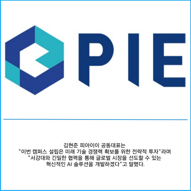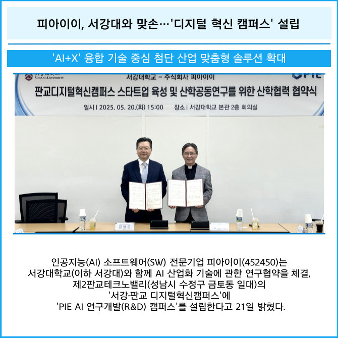 [프라임경제] 인공지능(AI) 소프트웨어(SW) 전문기업 피아이이(452450)는 서강대학교(이하 서강대)와 함께 AI 산업화 기술에 관한 연구협약을 체결, 제2판교테크노밸리(성남시 수정구 금토동 일대)의 '서강·판교 디지털혁신캠퍼스'에 'PIE AI 연구개발(R&D) 캠퍼스'를 설립한다고 21일 밝혔다.