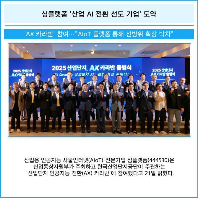 [프라임경제] 산업용 인공지능 사물인터넷(AIoT) 전문기업 심플랫폼(444530)은 산업통상자원부가 주최하고 한국산업단지공단이 주관하는 '산업단지 인공지능 전환(AX) 카라반'에 참여했다고 21일 밝혔다.