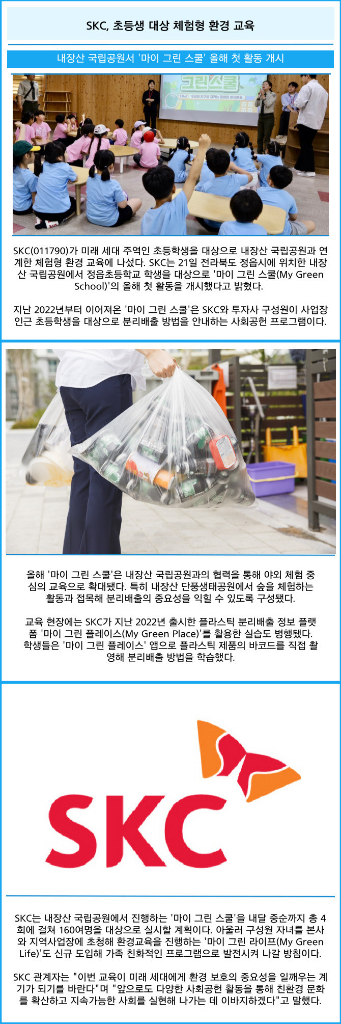 [프라임경제] SKC(011790)가 미래 세대 주역인 초등학생을 대상으로 내장산 국립공원과 연계한 체험형 환경 교육에 나섰다. SKC는 21일 전라북도 정읍시에 위치한 내장산 국립공원에서 정읍초등학교 학생을 대상으로 '마이 그린 스쿨(My Green School)'의 올해 첫 활동을 개시했다고 밝혔다.