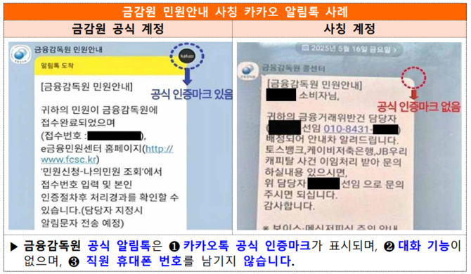 최근 사기범들이 금감원 카카오톡을 사칭해 금융거래법 등을 위반했다며 대화를 유도하는 수법도 나타나고 있다. 카카오톡 기관인증 마크가 없거나 직원 휴대폰 번호를 남긴 금감원 알림톡은 무조건 사기다.