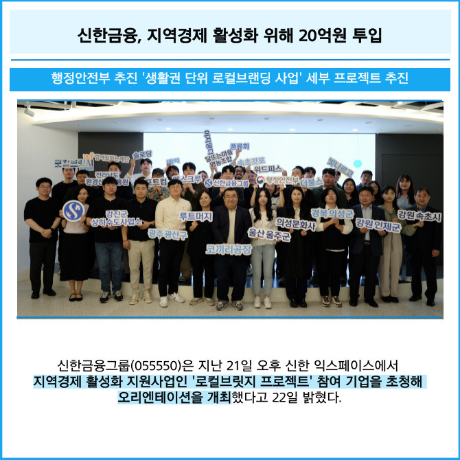 [프라임경제] 신한금융그룹(055550)은 지난 21일 오후 신한 익스페이스에서 지역경제 활성화 지원사업인 '로컬브릿지 프로젝트' 참여 기업을 초청해 오리엔테이션을 개최했다고 22일 밝혔다.