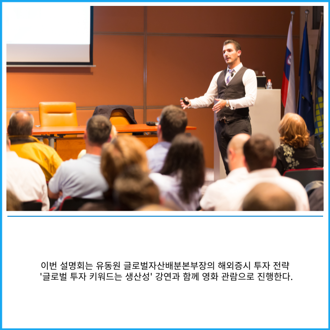 이번 설명회는 유동원 글로벌자산배분본부장의 해외증시 투자 전략 '글로벌 투자 키워드는 생산성' 강연과 함께 영화 관람으로 진행한다.