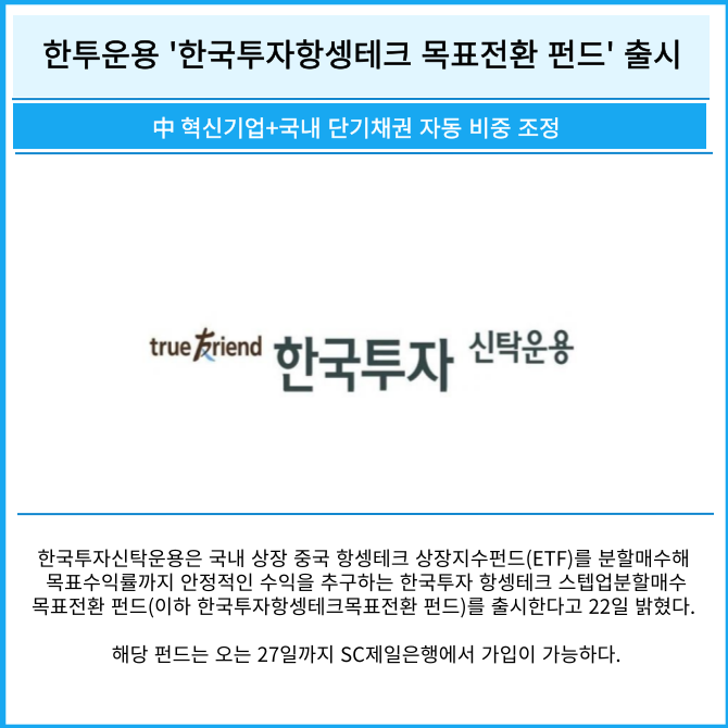 [카드] 한투운용 '한국투자항셍테크 목표전환 펀드' 출시
