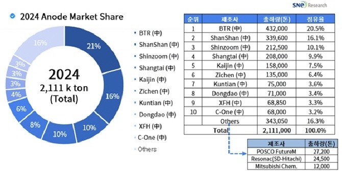출하량 상위 10곳은 모두 중국 업체였다. 출하량 기준 1위는 BTR로, 총 43만2000톤 이상을 출하했다. 이어 △샨샨(33만9600톤) △신줌(21만2500톤) △상타이(20만8000톤) △카이진(15만8000톤) 등의 순이었다. 상위 10곳의 점유율은 84%에 달한다.