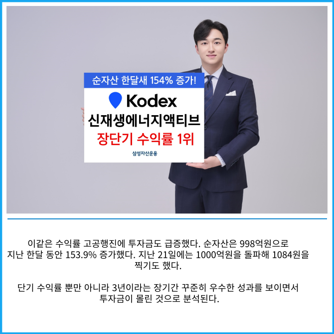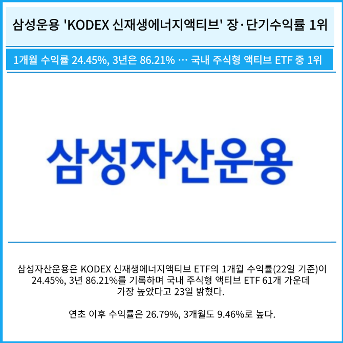 [프라임경제] 삼성자산운용은 KODEX 신재생에너지액티브 ETF의 1개월 수익률(22일 기준)이 24.45%, 3년 86.21%를 기록하며 국내 주식형 액티브 ETF 61개 가운데 가장 높았다고 23일 밝혔다.
