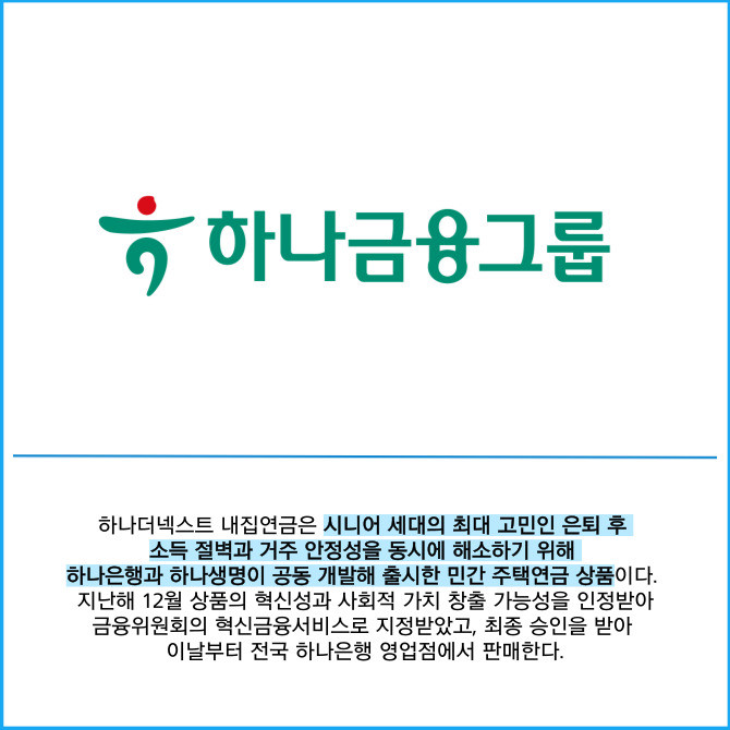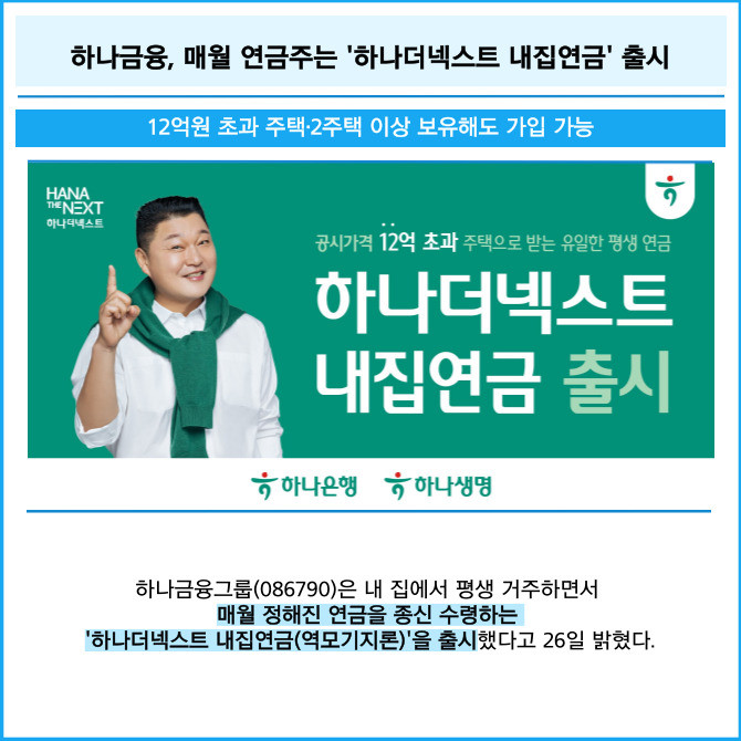 [프라임경제] 하나금융그룹(086790)은 내 집에서 평생 거주하면서 매월 정해진 연금을 종신 수령하는 '하나더넥스트 내집연금(역모기지론)'을 출시했다고 26일 밝혔다.